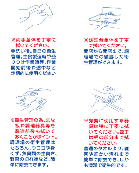 特に、調理場の衛生管理に特におすすめです。 魚のウロコや身くず、生臭い魚貝類の汚れ、野菜のカット時に出る切れ端など、まな板や調理台に残りやすい様々な汚れを瞬時に除去。調理後の生臭さを取り除き、衛生的で快適な作業環境をサポートします。