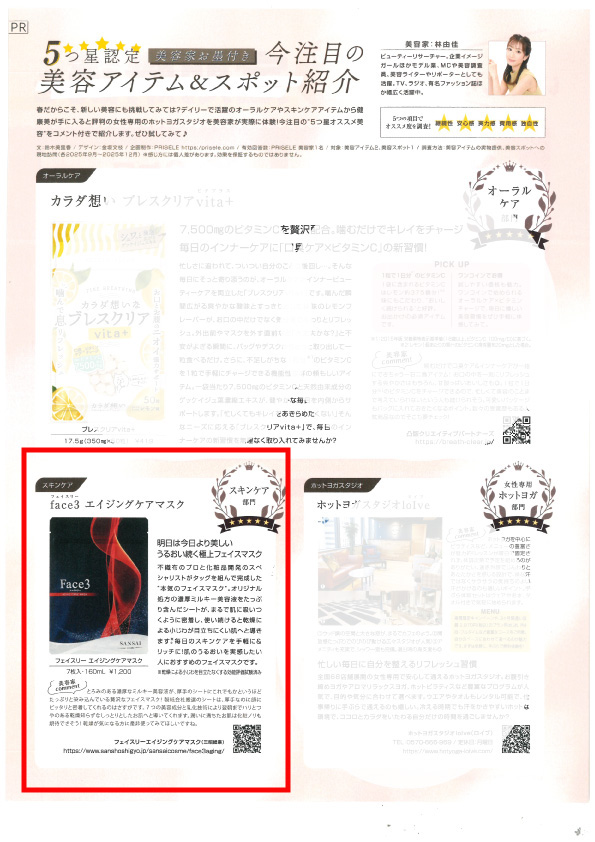 雑誌ESSE3月号 「5つ星認定 美容家お墨付き 今注目の美容アイテム&スポット紹介」特集に、フェイスリーエイジングケアマスクが掲載されました!